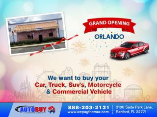 Most of all you can now simply walk in with your vehicle, get appraised, complete paperwork, and walk out with your money all in one day with AUTOBUY’s shop in your own city. Your woes of finding the best cash for cars dealer in Orlando are finally over. If you are a resident of Orlando and you are thinking of selling your car, you won’t get a better time to do so.Visit our website at wepaythemax.com or call us at 888-203-2131 today to sell your used car in Orlando, Florida for the max cash today!
